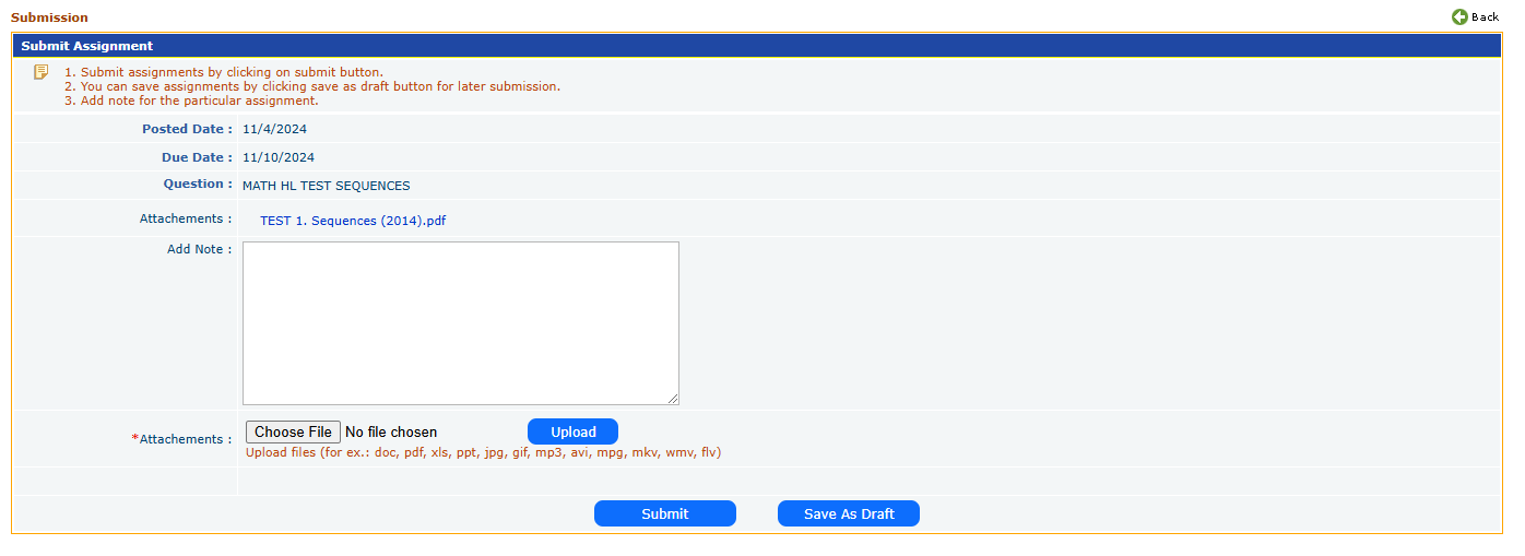 - Uploading Files: Students can upload their completed work by selecting a file from their device. Supported formats include documents, images, and some multimedia types.