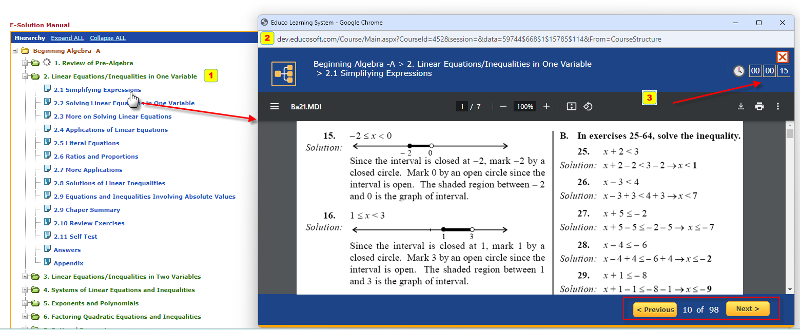 - Time Tracking: A visible timer tracks how long the student has been viewing the e-Solution Manual, possibly for timed reading or session tracking.