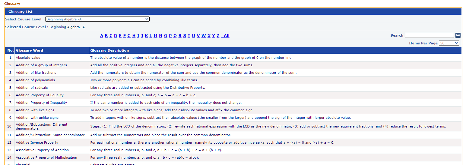 - A dropdown menu that allows users to choose a specific course level. This customizes the glossary to show terms relevant to the selected course level.