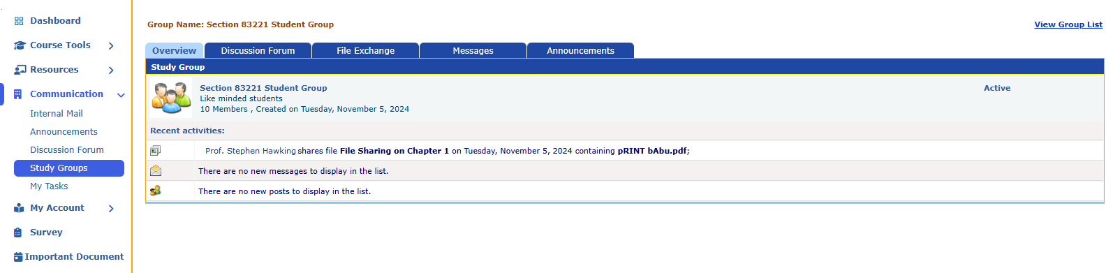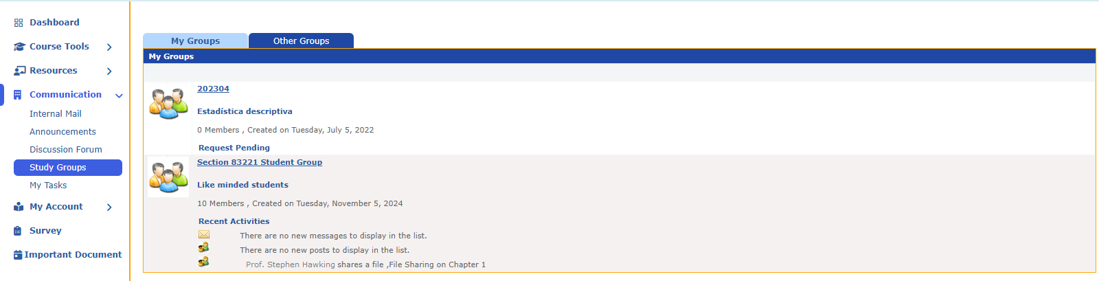 - Discussion Forum: Each group likely has a discussion forum where members can post threads, ask questions, and share insights related to their study topics.
