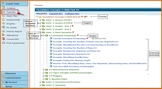 - Users can click on the title of any Tutorial activity (in blue) to view its content.